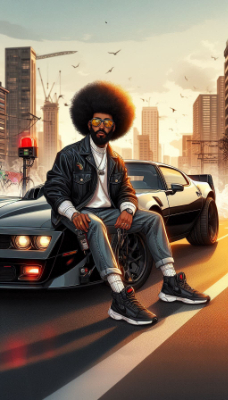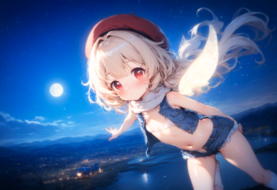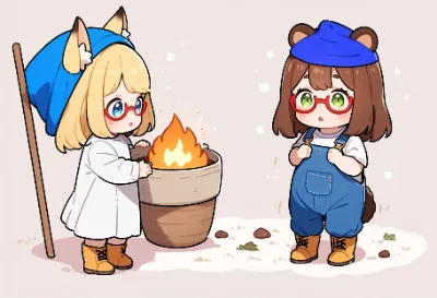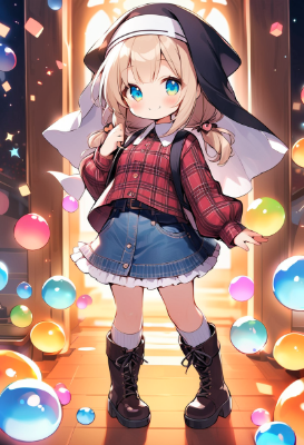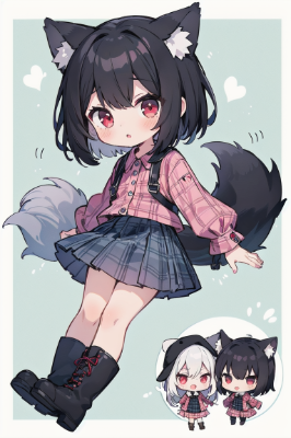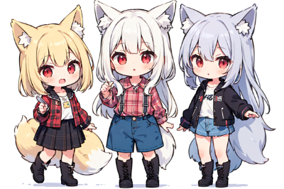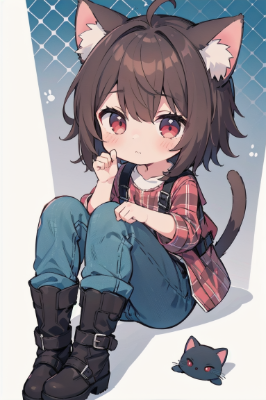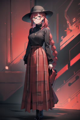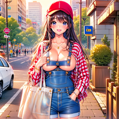 赤い帽子、チェック柄のシャツ、デニムのオーバーオールのコーディネート