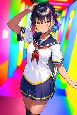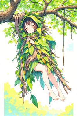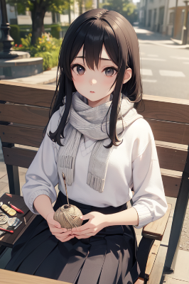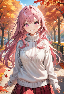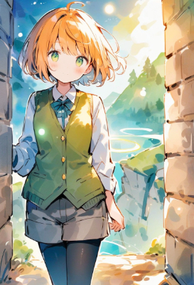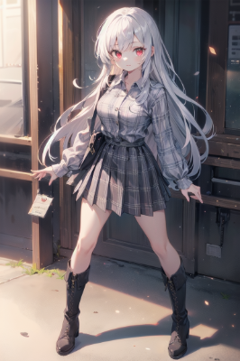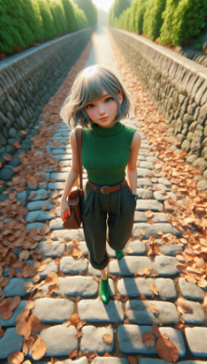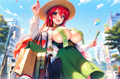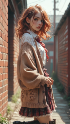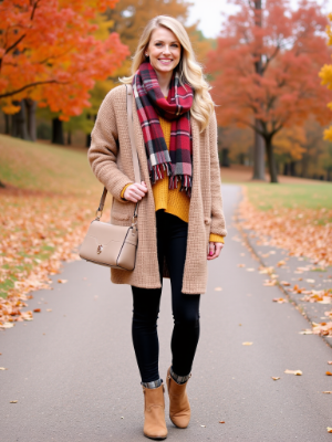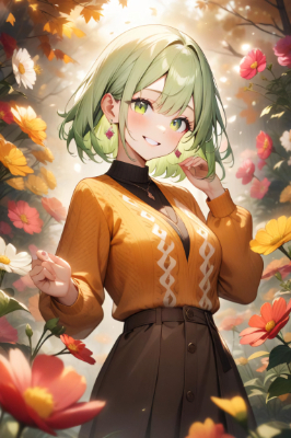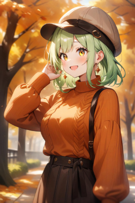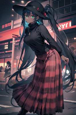 麦わら帽子、緑のセーター、チェック柄スカートのコーディネート