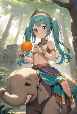 ゾウに乗ってみかんを食べるミク