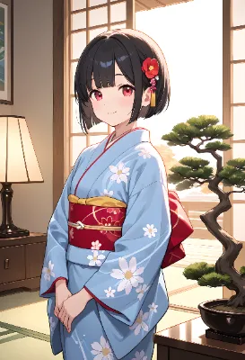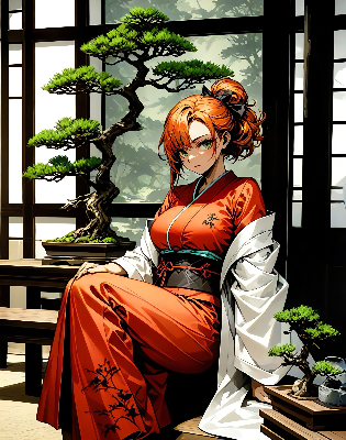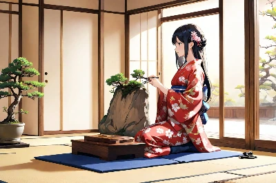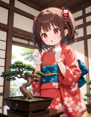 紅の着物と盆栽と
