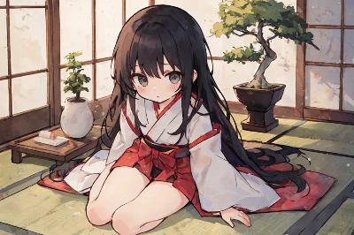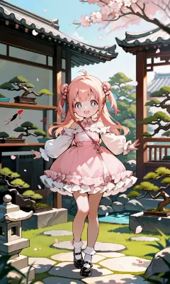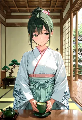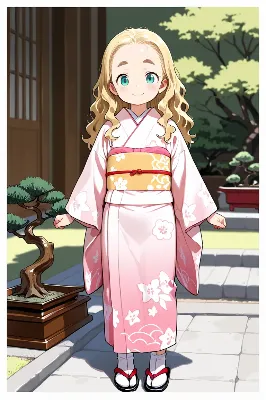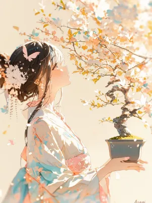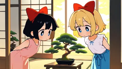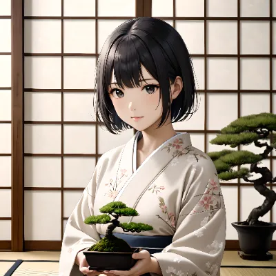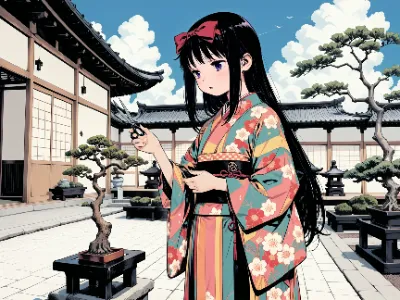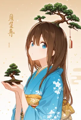 盆栽と着物姿の少女