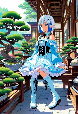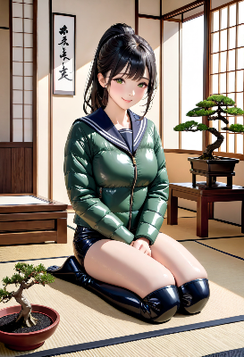 盆栽と、ニーハイブーツで正座するJK on畳