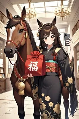 福袋を馬に乗って買いに行く文化がある世界線の新年初配信をする少女と馬