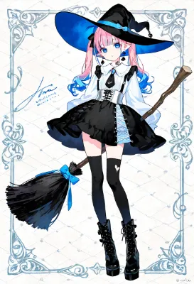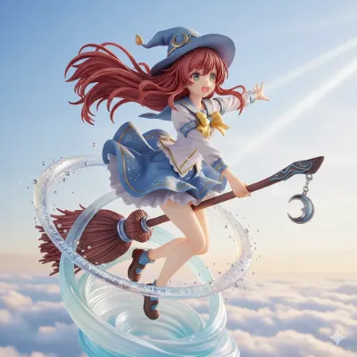 魔法の箒に跨る青髪魔女