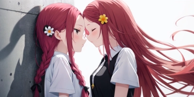 金髪リボンちゃんの巨乳にほっぺをあてる黒髪ちゃん