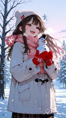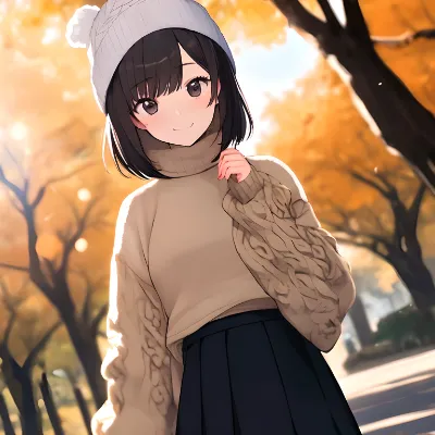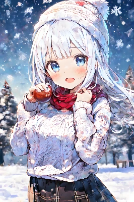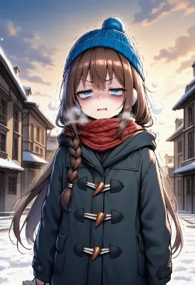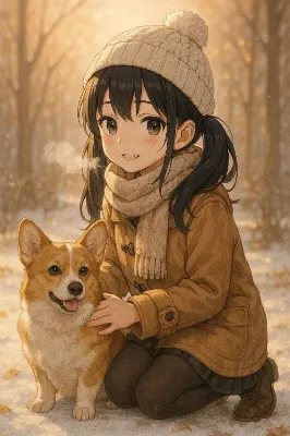 冬の散歩道とコーギーに寄り添う八重歯少女