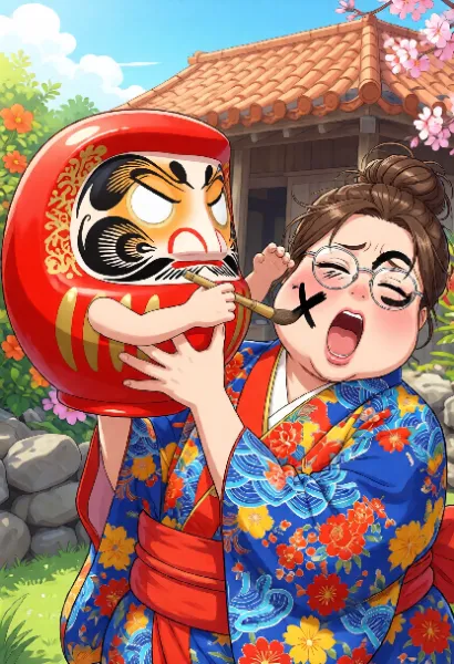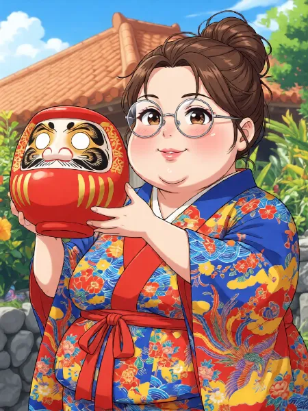 だるまを抱くぽちゃり娘