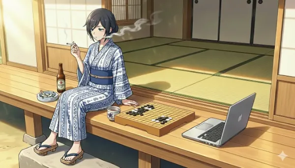 夏の夕暮れ、縁側で一服 浴衣と囲碁とビール