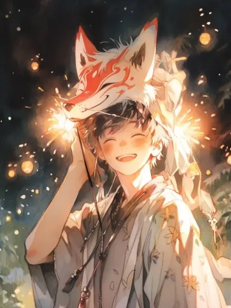 人といっしょに花火を楽しむ狐
