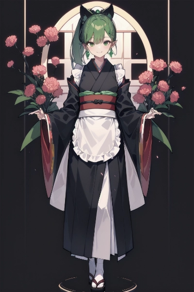 (人間、ポニテ、緑髪、着物、喫茶店)