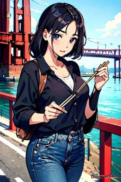 箸を持って橋を渡る女の人