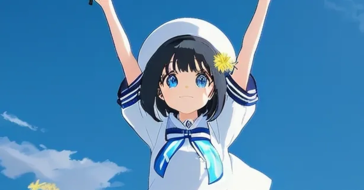 大きいタンポポを使って空を飛んでいる少女