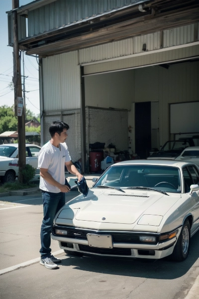 自分の趣味車を洗車する親父。