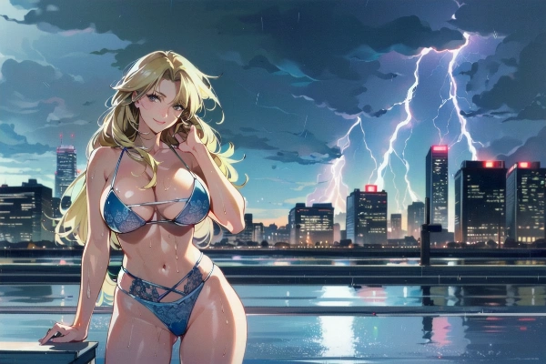 激しい雷雨の中、下着姿で、自宅のプールを楽しんでいる女性