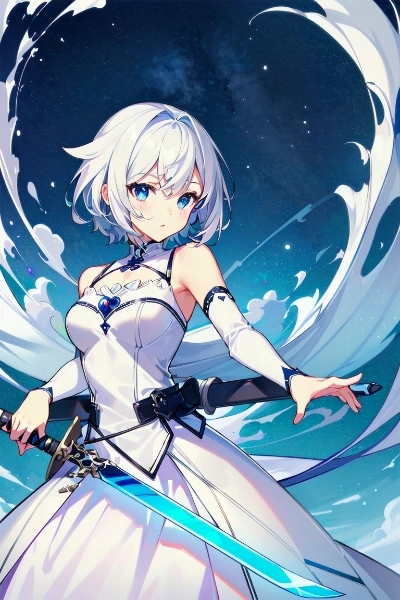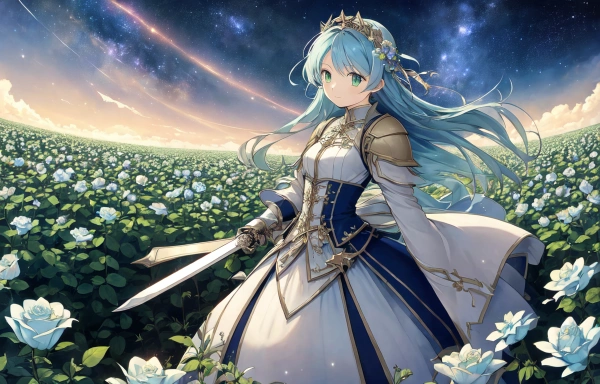 星空の下、青髪ロングな騎士と青薔薇の花畑